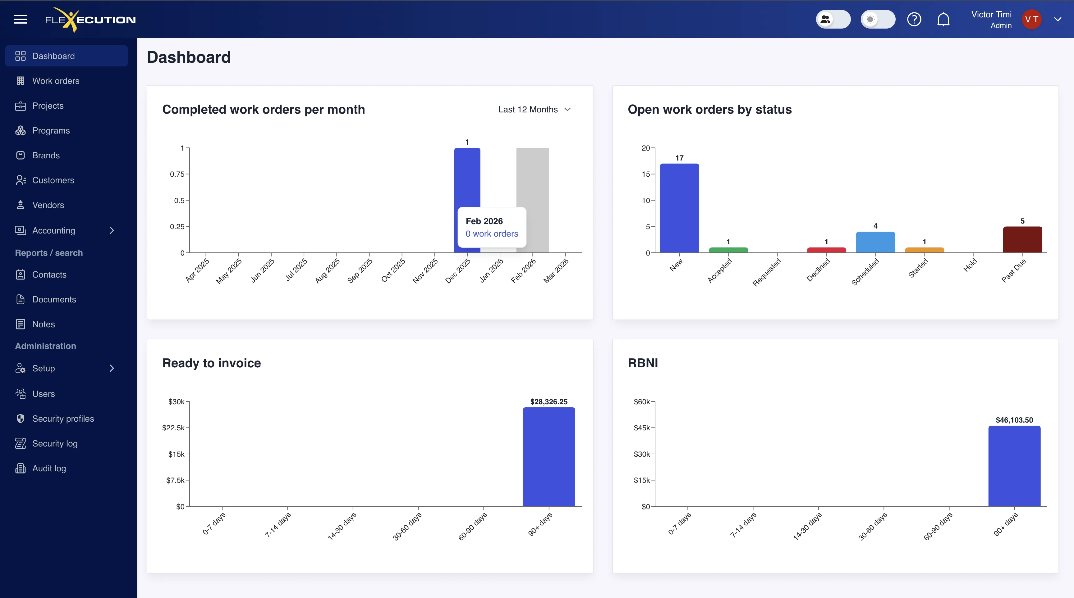 Project and operations management app for businesses. Manage projects, customers, vendors, work orders, and related data (contacts, documents, notes, sites, brands). Users log in, see a dashboard, and use role-based access and security profiles. Built for teams that need one place to run projects, track vendors and customers, and handle work orders and reporting.